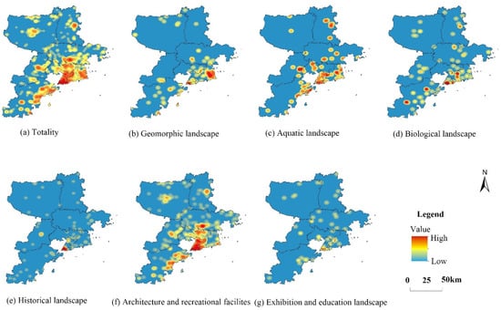 The KDE analysis is utilized to further explore the specific characteristics of the spatially distributed aggregation of tourist attractions. The spatial distribution is uneven, with obvious regional differences, showing the characteristics of “multi-center” development. Overall, tourist attractions were mainly distributed in the Shinan, Shibei, Laoshan, and Licang Districts, with the highest density in Shinan. It decreases from the above four districts to the periphery, followed by Huangdao, Chengyang, and Jimo, and Jiaozhou, Pingdu, and Laixi have the smallest number of tourist attractions (Figure 4a). Among them, the geomorphic landscape is mainly located in the Laoshan Mountain Range in the eastern part of Laoshan and the Zhushan Mountain in the central part of Huangdao (Figure 4b). The high-density area of the aquatic landscape is distributed in a strip from north to south in the Dagu River and its tributaries and the recreational waters along the coast (Figure 4c). The biological landscape in Shinan, Jimo, and Huangdao has formed high-density areas, characterized by “multiple cores” (Figure 4d). The historical landscape is concentrated in the southern part of Shinan and the southern part of Shibei, which is a historical urban area with abundant historical buildings, historical and cultural neighborhoods, and ruins (Figure 4e). The architectural and recreational landscape is the most numerous and widely distributed tourist attraction, forming an obviously high-density area in Shinan, Shibei, and Licang (Figure 4f). The exhibition and education landscape is evenly distributed with no obvious high-density areas (Figure 4g).