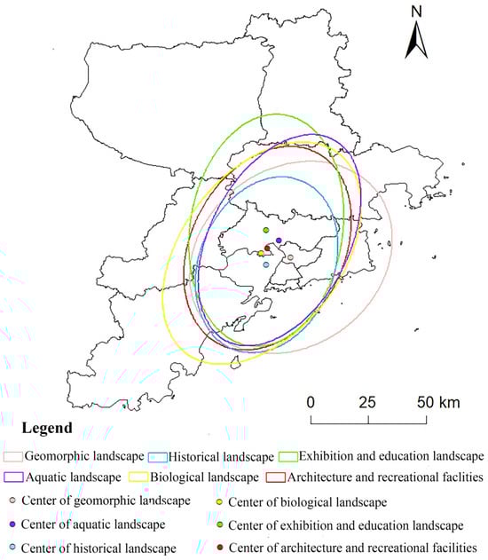 To more easily perceive the changes in trends, distribution direction features, and geographical distribution pattern of Qingdao’s tourist attractions, this study analyzes the parameters of SDE (Figure 5). From the results of the SDE, the tourist attractions in Qingdao are mainly distributed in the city center, with a southwest–northeast direction, which is basically consistent with the shape of the Qingdao City area.
