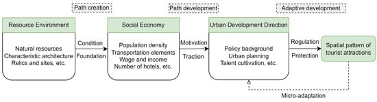 Based on the above detection results, combined with the path dependence theory [51,52], the mechanism of the role of natural environment, socio-economic, and other factors on the spatial differentiation of tourist attractions in Qingdao is explored from three aspects: conditions, dynamics, and regulation. The formation mechanism is shown in Figure 6, including three stages: path creation, path development and adaptive development. The generation of tourist attractions originates from a specific environmental foundation. In the path creation stage, the elements of resource environment are the basis for forming the spatial pattern of tourist attractions. The development of tourist attractions also needs the traction of economic development and in the path development stage, social economic elements are the motivation. The policy background, urban planning, and talent cultivation have become important guarantees to help the tourism industry form advantages. In the adaptive development stage, urban development direction plays a macro-regulatory role in the space of tourist attractions.