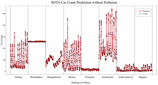 The significance and impact of pollution and time were investigated in the first two experiments. The first experiment on Dataset-1 demonstrated that the model’s overall MAE score dropped from 19.706 to 19.243 when pollution data were included. Taking this into account, pollution features were eliminated from additional studies. The fact that pollution can only be linked to traffic data that include characteristics like carbon monoxide and nitrogen dioxide could be one of the primary causes. In the second experiment on Dataset-1, we observed the effect of time feature. Time was also extracted as the second format of a day where 12:00 AM was transformed to 0, 1:00 AM was transformed to 3600, and so on. Time data in such a format reduced the overall MAE score from 26.594 to 19.547. For example, Figure 6 demonstrates that time is a feature and the prediction results cannot reach the real values because the value of the time range feature is from 0 to 82,800, while other features are not so wide. It can be obviously seen in the Skolebakken parking lot. When time is not considered as a feature, as seen in Figure 5, the prediction results are more likely to approach actual values. Intuitively, it can be deduced that the model cannot find the best weights for such wide-ranged data.