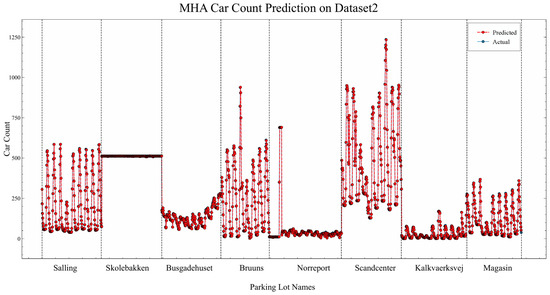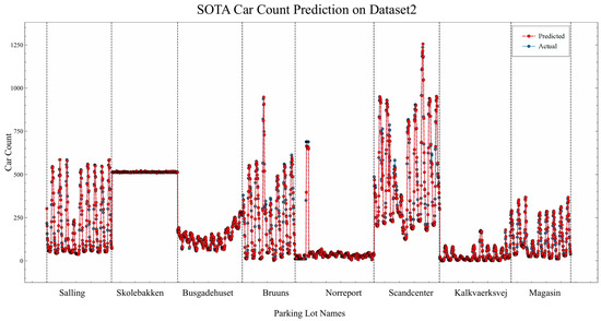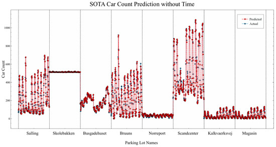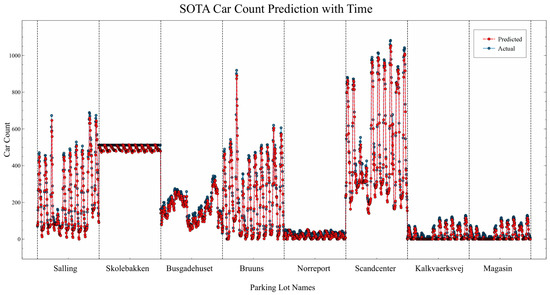 In the second experiment, the effect of time data was examined using the SOTA LSTM model again. As seen in Figure 5 and Figure 6, in all of the parking lots, the time data shift the count of the data to higher numbers, which results in a higher MAE score. While Figure 5 shows that LSTM on Dataset-1.3 (without time) has a 19.546623 MAE score, Figure 6 shows that LSTM on Dataset-1.4 (with time) has a 26.59367 MAE score. Both Figure 5 and Figure 6 indicate that the difference between the predicted and actual values can be clearly spotted. Similarly, the difference can be seen in the parking lot “Skolebakken”.