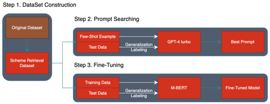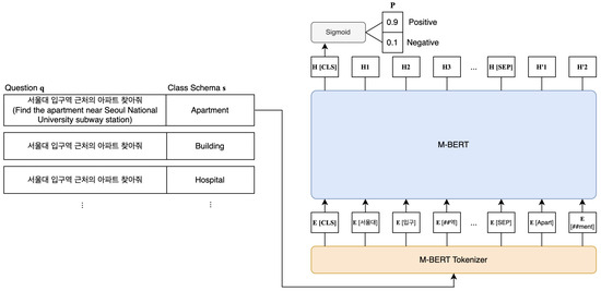 In this study, in order to compare the performance of the proposed few-shot prompting-based schema retrieval model with traditional fine-tuning methods, we implemented a dense schema retrieval model based on M-BERT. M-BERT, developed by Google, is a multilingual version of the BERT model. It was pre-trained on a Wikipedia corpus encompassing 104 languages and has shown a strong performance in natural language processing tasks for languages for which there are fewer resources [38]. Although there are models specifically tailored for Korean, such as KR-BERT [39] and KoBERT (https://github.com/SKTBrain/KoBERT (accessed on 12 December 2024)), which were developed by SKTBrain, they have limitations in terms of validation for multilingual tasks involving Korean queries and English schema labels. Thus, M-BERT was selected due to its potential applicability to datasets in various languages.