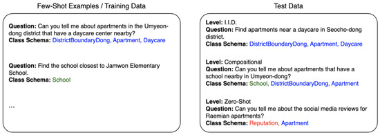 - I.I.D. generalization: This level assesses the model’s ability to handle queries that align with the schema items and question structures seen in the few-shot examples or training data. For example, as you can see in the left side of Figure 2, there is a training data point that asks “Can you tell me about apartments in the Umyeon-dong district that have a daycare center nearby?” and employs class schema items “apartment”, “DistrictBoundaryDong”, and “daycare”. A corresponding I.I.D. level test data point could be “Find apartments near a daycare in Seocho-dong district”, which uses a similar question structure and identical schema combination.