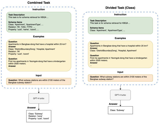 While it is common to train separate models for class, relation, and property schemas in dense schema retrieval using fine-tuning [4,6], few-shot prompting allows for the creation of prompts that can search all three types of schemas simultaneously. This approach can complete all tasks with a single API call, potentially reducing inference time. However, the increase in task complexity could lead to reduced performance. Simpler tasks performed that are through prompts are likely to enhance performance [28,30]. We conducted experiments to compare combined and divided task approaches. An example of the prompts used in the experiments is shown in Figure 3. The right image only represents the divided task method for class schemas. In actual experiments, searches for class, relation, and property schemas are conducted separately for the same input question, and the results are synthesized.