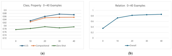 Few-shot examples are used to enhance the model’s understanding of schema retrieval tasks by demonstrating specific examples. In classification tasks like schema retrieval, providing a greater number of examples generally increases model accuracy; however, beyond a certain point, the rate of performance improvement significantly diminishes [11,28,29]. As the prompt lengthens, both the amount of data to be processed and the computational complexity increase, making it crucial to determine the optimal number of examples. In this study, we systematically increased the number of examples included in the prompt from 0 to 40, in increments of 10, to observe performance changes and identify the most efficient number of few-shot examples.