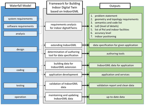 In our framework, the phases for system requirements, software requirements, and requirement analysis of the original waterfall model are merged into a requirement analysis of an indoor digital twin in the proposed framework. The reason for this is that, unlike software development, there is no need to distinguish these phases in the construction of a digital twin, as they refer to the same task.