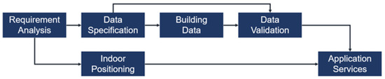 For the reason of simplicity, we have chosen the waterfall model [30] as the framework for the data construction process for our digital twin. The waterfall model is the most classic software development life cycle model and suitable for application to the development of systems for which procedures are relatively well-established such as indoor spatial digital twins. It is, however, possible to apply other software development life cycle models such as the V-model [31], or spiral model [32] and we leave the choice of life cycle model as a future work. The framework that we propose in the paper is shown in Figure 1.