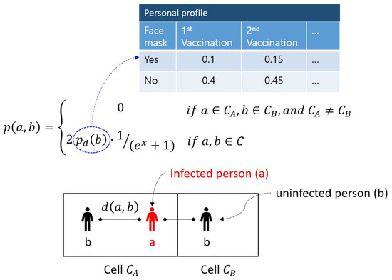Figure 3. Person-to-Person Infection Model.Infection does not occur if a and b are staying in different rooms and the probability , therefore, becomes 0. Otherwise, the infection probability model is inversely proportional to the square of distance between a and b. In our model, we assumed that the base infection probability is determined by the personal profile of each uninfected individual as shown in Figure 3. Note that the logistic function is applied instead of to make the probability curve smooth. - Person-to-Surface (P2S): The second infection model is indirect contact, such as touching doorknobs or elevator buttons. This varies greatly depending on the material of the contact surface. For example, it is reported in [27] that on wood, the virus can survive up to a day, and the infection probability decreases to a order reduction by 2.18 within three hours in a 0.05 TCID 50/mL environment. The survival period of the virus differs for other materials, but the infection probability generally decreases on a logarithmic scale similar to that of wood.