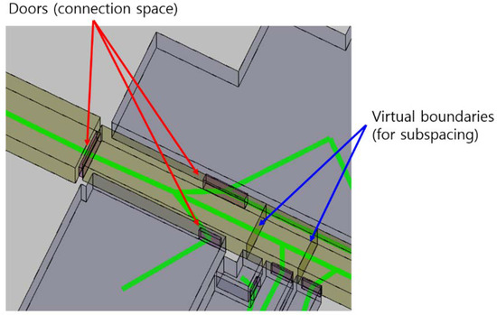 The topological model of IndoorH allows the description of the connectivity between rooms and doors. An example of connectivity in indoor space is shown in Figure 6, which includes two types of connectivities. The first type is via a cell such as a door cell, which is defined as ConnectionSpace in IndoorGML as indicated by the red arrows of Figure 6. The second type is via a surface, which is defined as ConnectionBoundary. In most cases, the connection boundaries are used to connect two cells partitioned for subspacing via the virtual boundaries indicated by the blue arrows in Figure 6.