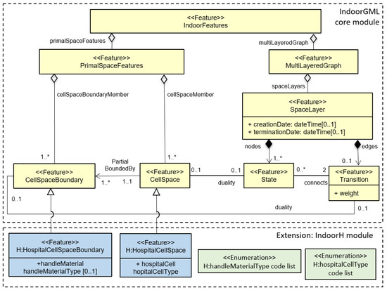 Figure 7 shows the integral data model with the extension IndoorH, which reflects the discussion in the precedent subsections. The extension for IndoorH includes two additional subclasses - H:HospitalCellSpace and H:HospitalCellSpaceBoundary inherited from CellSpace and CellSpaceBoundary, respectively. These contain properties to specify the classification of cell types and door handle materials, based on the code lists shown in Table 3 and Table 4.