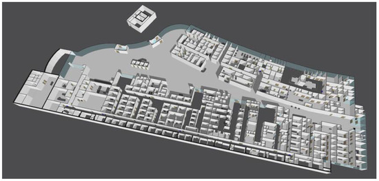 Refs. [6,7,8] comprehensively introduce cases of digital twins for hospitals and healthcare. These include not only digital twins for hospitals but also various digital twin examples for healthcare. A hospital digital twin is a type of indoor digital twin and must provide specific functions required by hospitals. Various studies and use cases have been developed, for example, ref. [9] presents a comprehensive use case. This research builds the indoor space of a typical digital twin based on BIM and introduces use cases that additionally support functions and services in hospitals. Ref. [10] also introduces a case study called HispiT’Win, which constructs a digital twin for hospitals to track patients’ movements and patterns within the hospital, allowing for appropriate action. Refs. [11,12] present proof-of-concept cases applying a real-time digital twin to Shanghai Municipal Hospital, focusing on real-time monitoring of patients and hospital logistics.