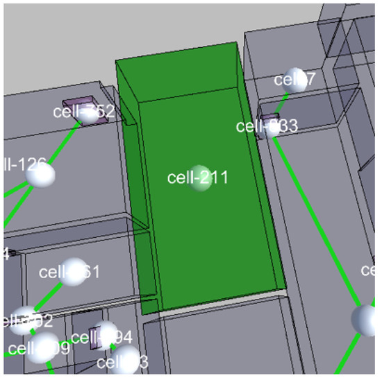 - Navigable cells: Checking if any navigable cell has at least a connection space (door) or connection boundary. This can be done in an automated way by scanning all navigable cells. For example, cell-211 in Figure 13 is a navigable space but has no connection to neighboring cells.