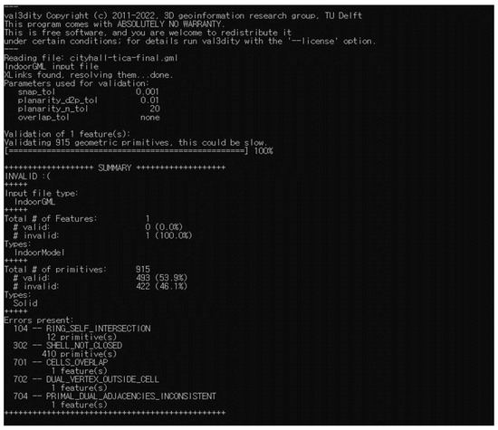 - Geometric errors and cross references: Geometric errors and cross references between XML elements are validated in an automated way by an open-source tool, called val3dity [38]. Figure 14 shows an example of the result reported by val3dity including a number of geometric errors such as self-intersection, a non-closed shell, and overlapping. It is expected that these errors come from floating point errors.