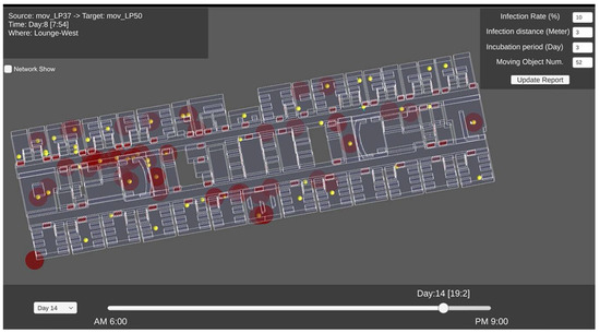 Third, the InCOVID+/P2P module applies the P2P infection model to the synthetic trajectories to determine the spread of infection using the P2P infection model explained in Section 4.1. The user interface of this tool is shown in Figure 15. In the dialog box at the top right, the user can select the parameter values required for the P2P infection model. Yellow dots represent uninfected people, red dots represent infected individuals, and red circles indicate the areas where virus transmission has occurred. By clicking on these areas, the user can find more information about the infection in the dialog box at the top left. The scroll bar below allows the time to check the infection status to be specified.