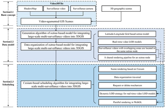 (1) We propose an octree-based model for integrating large-scale multi-surveillance videos into 3DGIS. This model partitions extensive video data utilizing an octree structure, resulting in a block-based organization. Our approach distinguishes itself from other models by grouping videos, particularly those with overlapping areas, into the same node of the model, which corresponds to a unified rendering pipeline. This facilitates the subsequent integrated management of multiple videos containing overlapping regions. Within each block of video data, this paper employs a dynamic LOD strategy to establish a hierarchical structure.