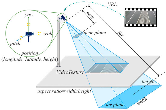 where S represents the acquired shadow map; V represents the video stream; denotes the process of forming a video texture with spatial features from the video and depth map and overlaying it onto 3DGIS scenes based on the transparency value (where ranges from 0 to 1); represents the extraction of video texture from the video stream. Specifically, the shadow map S is generated using the ShadowMap technique M(P) with input camera parameters P. P can be broken down into: Intrinsic parameters , including the Field of View (FOV), near plane, far plane, and aspect ratio of the video; and Extrinsic parameters , which primarily consist of the camera’s geographical location (longitude, latitude, and height) and orientation (yaw, pitch, and roll). Besides, the video stream is obtained by parsing the URL and HTML code associated with the video’s web address. It is worth noting that while many scholars have conducted in-depth research on camera distortion correction and video registration, these topics are beyond the scope of this paper and will not be discussed further here.