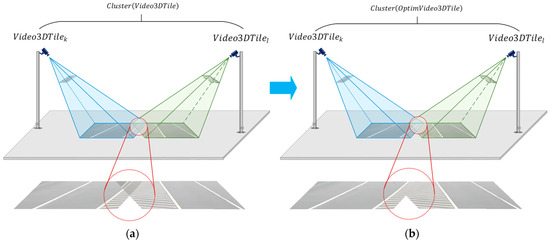 Figure 5a demonstrates that when multiple surveillance cameras cover the same area, with either full or partial scene overlap, they create clustered video tiles, denoted as Cluster(Video3DTile). Specifically, Cluster(Video3DTile) represents a collection of VideoTiles that have overlapping video areas. Furthermore, the video textures of any two Video3DTiles share an intersection, which can be depicted by Equation (2):