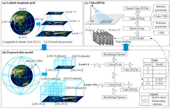 As shown in Figure 6a,b, the proposed data organization method primarily refers to the 2D map division approach using the LLG. This method begins at level 0 by dividing the entire 2D Earth space into two subspaces of the same span based on latitude and longitude. Then, these subspaces are progressively subdivided according to the quadtree rule, resulting in a multi-level tile pyramid. Therefore, when extending this concept to 3D space in this paper, to ensure consistency in span, longitude, latitude, and height, the octree root node, OctreeRoot, is divided into subspaces with longitude and latitude spans of 180°, and the initial height is set to 20 km (i.e., half the circumference of the Earth). As illustrated in Figure 6b, according to the octree division characteristics, each octree node, OctreeNode, includes 0 or 8 sub-nodes. Unlike other organization methods, the OctreeNode in this paper defines one programmable rendering pipeline and stores up to a certain number of Video3DTiles, limited by the texture maximum number of WebGL [33]. This rendering pipeline is used for subsequent parallel processing of all Video3DTiles within the node. Combining the characteristics of WebGIS with the real-time nature of video streams, this paper implements a dynamic LOD strategy by adjusting the video frame sampling frequency. Among these models, the update frequencies for LOD1 to LOD6 are set to 1%, 5%, 10%, 20%, 50%, and 100%, respectively. Obviously, Video3DTile (LOD = 6) is equivalent to Video3DTile. It is important to note that despite having different video stream update frequencies, all LOD models represent the same Video3DTile.