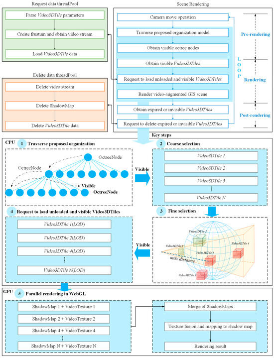 The core idea of this algorithm is to enhance the large-scale visualization of video-fused geographical scenes by integrating Cesium-based rendering strategies with out-of-core rendering techniques. Initially, the algorithm utilizes a Breadth First Search (BFS) traversal on the octree-based model (see Section 2.2) to identify the visible octree nodes within the current scene. From these nodes, it further selects the visible Video3DTiles. After these two rounds of filtering, a manageable number of Video3DTiles within the current scope are obtained. Next, the algorithm employs a request thread pool to parse each Video3DTile’s video data and construct shadow maps. Meanwhile, for the Video3DTiles that have been selected and processed, based on a dynamic LOD strategy, different frame extraction frequencies are applied to obtain the video textures. These textures are rendered into geographical scenes using an improved video-augmented GIS method (see Section 2.1). That is, the algorithm employs GPU’s parallel-optimized rendering for video textures within the same node to improve rendering efficiency. Finally, for the invisible Video3DTiles, a deletion thread pool is utilized to remove the shadow maps and parse the video stream modules, ensuring that the currently running Video3DTiles maintain low data volumes. Besides, this scheduling algorithm adopts threshold values for video processing based on the 3DTiles rendering strategy, with a default maximum threshold for the current number of videos [29]. These thresholds can be adjusted according to specific scenarios in practical applications to enhance the practicality of the scheduling algorithm presented in this paper. The algorithm implementation for each stage is described as follows (illustrated in Figure 7):