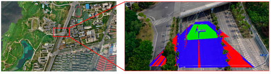 As indicated by the red-marked area in Figure 10a, when the distance from the current camera position to the ground was 1160 m, previous methods displayed video-fused scene information. However, computer displays have a fixed resolution. When viewed from a distance, the video-fused scene occupies only a small fraction of the screen’s pixels, thus decreasing video clarity. Consequently, detailed information features become indistinct. Therefore, the proposed method, considering the inability to view corresponding feature information at excessive distances, achieved the same visualization effect by not displaying the video-fused scene information (see Section 2.2.2). Additionally, when the distance was 344 m, the method proposed in this paper and Method 1 visualized the same effect for video-augmented 3D scenes, as shown in the red-marked area of Figure 10b. At this relatively short distance, the scene covers a substantial portion of the screen’s pixels, thereby enhancing video clarity. To ensure high-quality visualization, the proposed method employs a dynamic LOD strategy to appropriately display and update the video stream. Furthermore, as illustrated in Figure 10c, when the distance was less than 44 m, all methods displayed video-fused 3D scenes. However, since Method 1 or Method 2 operated independently for two surveillance videos and there was a certain distortion in the video-fused geographical scenes, the left red-marked area in Figure 10c demonstrated significantly mismatched lane lines, indicating a significant artifact issue. In contrast, this article adopted the highest frequency to update the video stream based on Table 2, achieving high-quality visualization effects. Meanwhile, the red-marked area in the right image adopted the proposed method, which merged and processed the textures of the two videos, thereby enhancing the visualization effect to a certain extent.