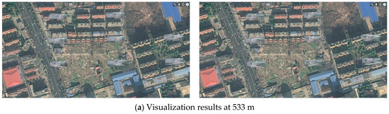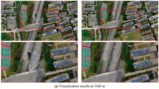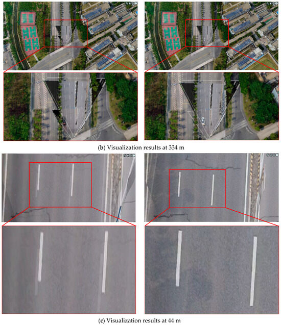 As shown in Figure 10, the experiment compared the visualization effects by varying the distances from the current camera position to the ground: 1160 m, 344 m, and 44 m. Both current methods (i.e., Method 1 and Method 2) and the proposed method were employed for comparative experiments, yielding their respective visualization results. It was noteworthy that Methods 1 and 2 produce consistent visualization effects; therefore, only the results of Method 1 were presented in Figure 10. Additionally, in the video-enhancement scenario, the transparency was set to to highlight the differences between the compared methods (for detailed parameter explanations, see Equation (1)).