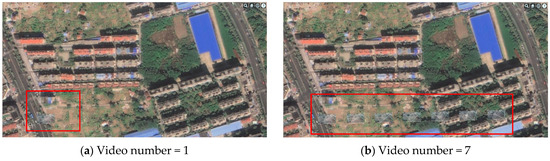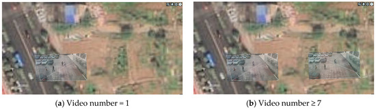 (2) When the scene camera was positioned 126 m above the ground, we conducted a comparative experiment. The results demonstrated that the visualization outcomes of the four methods remained consistent. To explain in detail, we selected Method 2 as an example and presented its visualization results in Figure 13. Moreover, it is worth noting that when the number of videos reached 700 or more, Method 1 failed to render due to the browser’s limited computational capacity and storage space. Furthermore, because the scene camera was positioned relatively close to the ground, only a limited number of videos could be displayed. Within the same range, when the number of videos was seven or more, both the proposed method and the comparison methods produced visualization results consistent with those shown in Figure 13b.