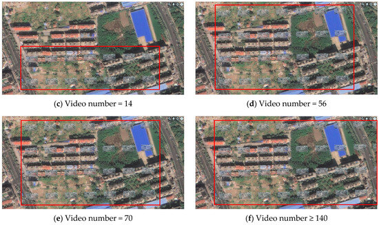 In contrast, the method proposed in this paper, as well as the other methods, employed strategies such as the out-of-core rendering mechanism to visualize the video-fused geographic scenes. Specifically, due to the excessive number of videos, only a portion could be displayed in the current scene. Therefore, when the number of videos was 140 or more, the visualization results of the proposed method, as well as those of the comparison methods, were consistent with those depicted in Figure 11f.