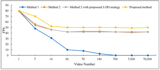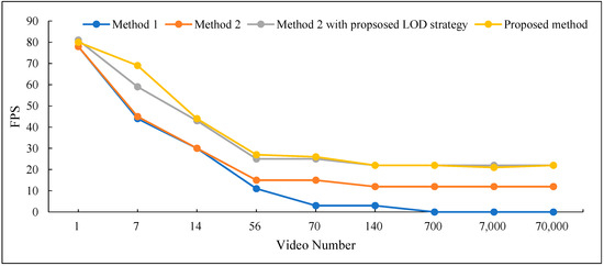 To evaluate the efficiency of the method introduced in this paper, we utilized the widely adopted Frames Per Second (FPS) metric to assess and compare the visualization rendering performance of alternative methods: Method 1, Method 2, and Method 2 combined with our proposed LOD strategy [16,18]. We virtually constructed non-overlapping surveillance scenes with equal intervals for the experiment. Specifically, each surveillance video covered a longitude and latitude span of 0.0007°, and we tested with varying numbers of videos: 1, 7, 14, 56, 70, 100, 700, 7000, and 70,000. The experiment recorded the frame rates and visualization results at 584 m and 126 m above the ground, respectively.