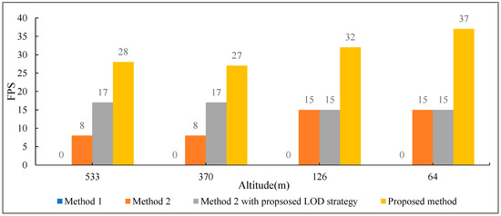 As shown in Figure 16, this experiment recorded the frame rates of different methods at 533 m, 370 m, 126 m, and 64 m, respectively. Among them, Method 1 could not run, and Method 2 maintained FPS within the range of 8~15 at different altitudes. Compared to Method 2 with the proposed LOD strategy, Method 2 had a higher FPS by 7 at 533 m and 370 m, while the two methods performed similarly at 126 m and 64 m. This is primarily due to the LOD reaching its maximum level at closer distances, leading to similar efficiency for both methods. However, the proposed method achieved higher frame rates at all altitudes. Compared to previous methods, the rendering frame rate of the proposed method increased by 11FPS, 10FPS, 17FPS, and 22FPS at different altitudes, respectively. In other words, the rendering frame rate was improved by an average of 95%. Therefore, the proposed method can effectively enhance the rendering efficiency in overlapping areas. It is worth noting that the proposed method needed four rendering pipelines at 126 m, whereas only a single rendering pipeline was used for parallel processing at 64 m.