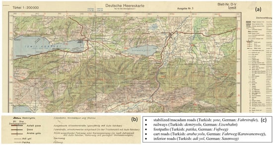 (a) An example of the DHK 200 Map Sheet D-V for İzmit, (b) part of the legend focusing on road types, (c) selected road type explanations with our English translations (Source: https://digitalarchive.mcmaster.ca/ accessed on 17 December 2024).