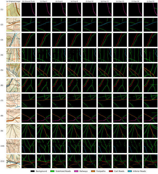 Figure 2 shows the visual results of the seven best-performing experiments in terms of F1 score and IoU (experiments 1, 6, 8, 10, 11, 13, and 14), along with the previous best-performing model (experiment 15). These are presented alongside the original input image and the GT for comparison. For the first patch, there is a short, stabilized road crossing the railway, as can be seen in the original image but not in the GT; however, experiments 6, 11, and 15 can successfully extract both the railway and the stabilized road. The results of experiment 15 illustrate that there is a mixture of stabilized roads with the coordinate grids, as can be seen in patches 6 and 8. However, for SegFormer-based models, this issue does not exist. In most cases, the best visual results were produced with experiment 14, such as patches 2, 4, 6, and 7. In some cases, all models generated good predictions, such as patches 3, 8, and 9.
