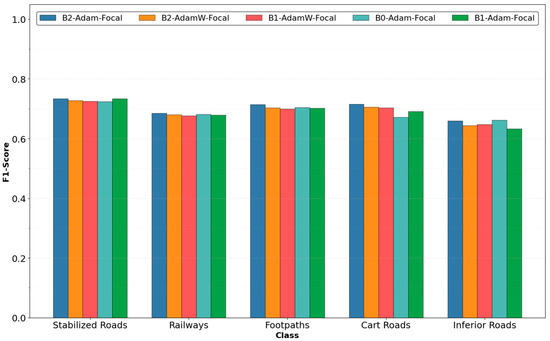 The class-wise evaluation (Table 3 and Figure 3) across the five best experiments highlights that the stabilized roads are most accurately detected, with F1 scores ranging from 0.724 to 0.734. Railways and footpaths show similar scores, with most of the models falling into the 0.67–0.71 range. Cart roads have the biggest variability among the models, with scores between 0.671 (B0-Adam-Focal) and 0.715 (B2-Adam-Focal), suggesting that the experiment configuration has significant effects for the detection of this road type. On the other hand, inferior roads presented the lowest F1 scores, varying between 0.633 and 0.662, indicating the identification of this road type is the most challenging one for this dataset.
