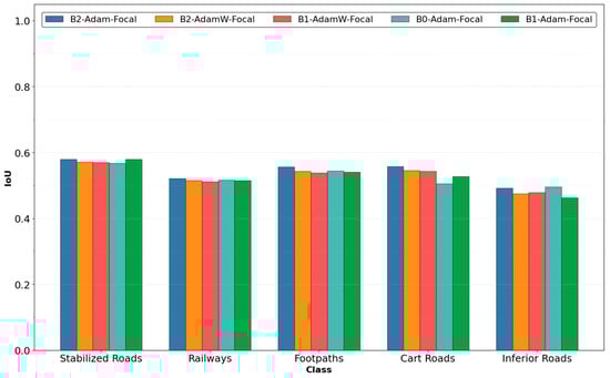 The class-wise IoU scores (Figure 4) follow a similar but with a lower pattern than the F1 scores, which is expected because of the nature of the metric itself. Stabilized roads again performed best, ranging between 0.567 and 0.579 with the best model (B2-Adam-Focal). Railways and footpaths show IoUs mostly in the 0.510–0.555 range, remaining consistent with the F1 score results. Cart roads again show more variability than other classes, showing results between 0.505 (B0-Adam-Focal) and 0.556 (B2-Adam-Focal). Inferior roads have the lowest IoU scores, suggesting that the category is the hardest one for models to learn in this dataset.
