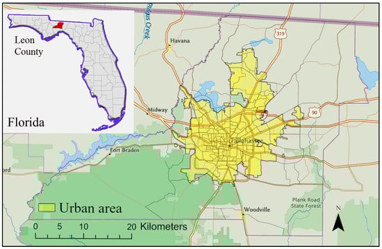 The proposed methodology was applied to a case study of Leon County located in the northwestern part of Florida, U.S. Tallahassee, the capital city of the State of Florida, is located in Leon County. According to the US Census 2020, the total population of Leon County is 292,198, and 196,169 people are settled at the urban core that includes Tallahassee []. The location of the study area (with county borders of Florida), the urban areas in Leon County, and the census block group borders are shown in Figure 1.