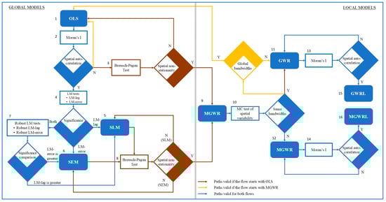 This framework could be started either from global (OLS) (Figure 2, box 1) or local (MGWR) modeling (Figure 2, box 9). In this study, we started from the global side (OLS) and solved all the models to compare their performances.