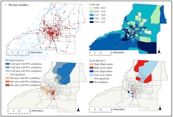 The spatial distribution of the severe (i.e., severe injury and fatal) crashes and VMT-adjusted crash rates of Leon County for 2017–2019 are given in Figure 3. The crashes are clustered around the city center, as hot spot analysis and Local Moran’s I analysis depict. Also, in the northern part, there are cold spots with low–low clustering. Moran’s I analysis for the crash rate returns an index value of 0.4, with a z-score of 9.27 and p-value of zero, which are clear indications of clustering in the dependent variable, severe crash rate.