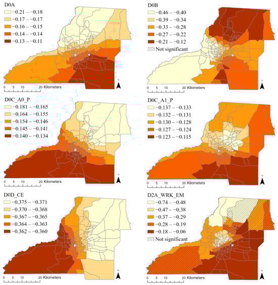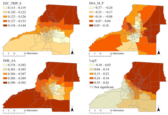 Firstly, MGWR is solved to examine varying bandwidths, as Comber et al. [] suggested. As seen in Table 6, the fitted model has different bandwidths (number of block groups) for several variables. For example, the percentage of motorized mode (D6A_M_P) has a bandwidth of 61 census block groups, meaning that it is not a global variable. The Monte Carlo simulation test confirms its spatial variability result with a significance value of 0.02, whereas the urban variable (D0A) is a regional variable with a bandwidth of 172 census block groups. If the bandwidths were similar for all variables and lower than the total number of block groups, GWR would be the better alternative, presenting different associations but with the same local scale for all variables. Since the bandwidths vary, MGWR is more appropriate for this spatial dataset. For the final step of this framework, the autocorrelation of the residuals is checked. As seen from Table 3, Moran’s I significance value is 0.16, which is not significant with 95% confidence. So, it could be assumed that MGWR responded to the autocorrelation problem in the global models.