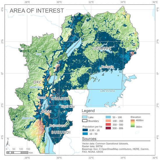 Our malaria risk use case aimed at identifying locations of populations in possible need of malaria-related healthcare assistance in a transboundary region encompassing Uganda, Rwanda, Burundi and the provinces of Ituri, North Kivu and South Kivu in the Democratic Republic of the Congo (DRC) (see Figure 1). This region of interest (ROI) as well as the critical malaria risk-related information needs were identified through a series of online meetings with MSF stakeholders working in epidemiology. The defined target was to identify regions exhibiting “emergency settings”, which were jointly defined as locations experiencing an interplay of violence, forced migration and limited healthcare, which are known to be prone to malaria outbreaks, and which are expected to experience above-average precipitation during the upcoming malaria season. The last point adds a forecasting component to the assessment, enabling proactive intervention planning ahead of the peak malaria transmission season. The use case is centered around the year 2020.