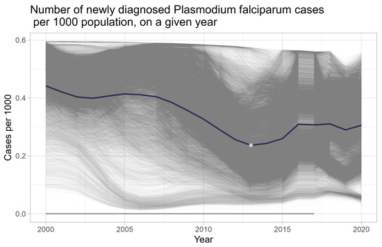 Shows the development of diagnosed Pf cases. Each line represents one 5 × 5 km grid cell. The bright point marks the year 2013 after which a trend reversal is noticeable. Source data: Malaria Atlas Project.
