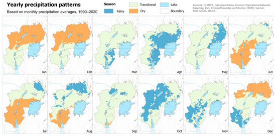 Informed by the stakeholders, it was conveyed that above-average precipitation either during or prior to the rainy season serves as a current indicator for anticipating a strong malaria season, as it promotes mosquito breeding conditions. To operationalize this insight, understanding the timing of the rainy season in the ROI was essential. The diverse topography and associated differences in precipitation regimes disqualified hard-coding season boundaries. Instead, we conducted an analysis of 30 years of monthly CHIRPS precipitation estimates [32], spanning 1991–2020, with a resolution of 0.05° × 0.05°, in order to identify year-round monthly precipitation patterns across all locations (see Figure 3).