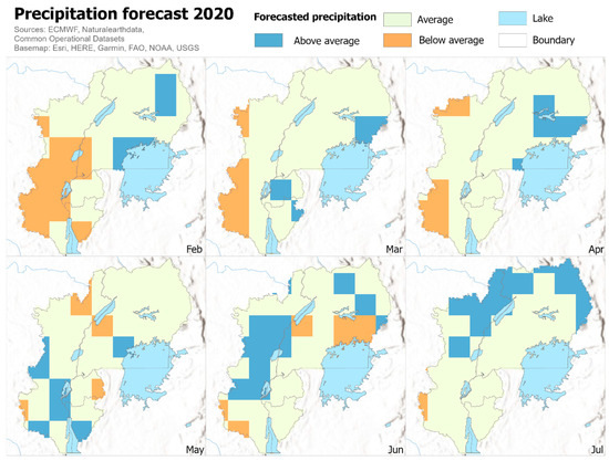 To determine the upcoming potential for higher malaria occurrences, we utilized the “Total precipitation anomalous rate of accumulation” from the “Seasonal forecast anomalies on single levels” dataset accessible through the Copernicus Climate Change Service (C3S) Climate Data Store (CDS) [53] (see Figure 4). The data are based on the SEAS5 real-time seasonal forecast system run by the European Centre for Medium-Range Weather Forecasts (ECMWF) [36].