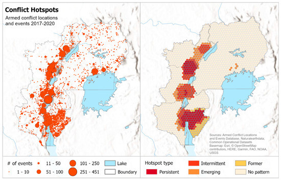 To determine ongoing conflicts, we utilized the Armed Conflict Locations and Events Database (ACLED). We used three years of events (2017–2019, divided into 3-month intervals) in conjunction with a space-time hotspot detection algorithm [59] to classify the ROI into regions of persistent, intermittent, emerging and former hotspots of conflict, and regions with no discernible conflict pattern.