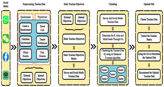 The proposed approach utilizes the combined power of the K-means algorithm and GA to optimize and cluster social media tourism data, ultimately identifying the optimal tourism path. This approach can be broken down into several stages: