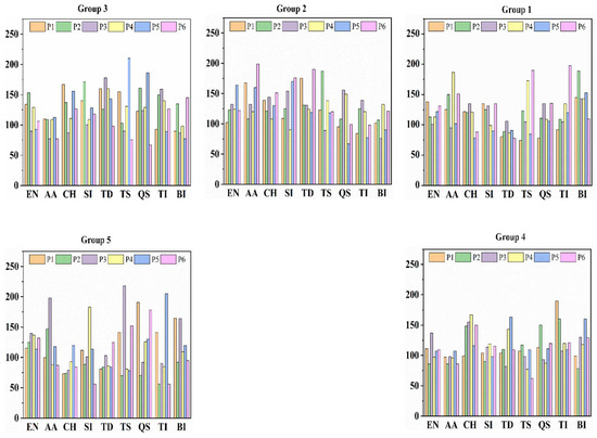 After creating tables categorizing tourism objectives into groups, we constructed a comprehensive tourism objectives matrix comprising 12 matrices, nine for internal objectives and three for external objectives. The numbers in the matrices represent the numerical differences between the numbers of visitors in the EN groups across various destinations. For instance, the value 25 in the EN objectives matrix corresponds to the difference in the number of visitors between destination P1 and destination P2 in Group 1 in Table 9. Consequently, we calculated the matrices for all nine internal objectives in the same manner as illustrated in Table 10. Following this, we calculated 12 optimal paths based on static tourism objectives using the improved GA. Our approach involved creating objective matrices to address the TSP.