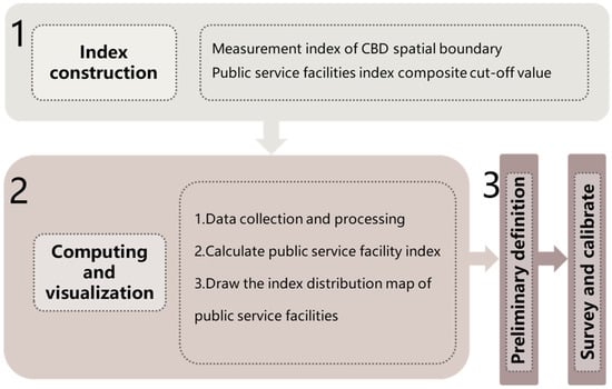 The scope of Xinjiekou’s CBD was defined using the public service facility index method []. This method takes into account the development characteristics of China’s urban central districts and is grounded on two key principles: (i) public service institutions are the functional essence of CBDs; (ii) the degree of spatial aggregation of public service facilities serves as a comprehensive measure for identifying the scope of the CBD. Hu and Yang proposed a methodology to define the spatial extent of CBDs based on the values of the Public Service Facility Height Index (PSFHI) and the Public Service Facility Intensity Index (PSFII), which were calculated using Formulas (1a) and (1b), respectively. The specific for defining the scope are illustrated in Figure 2.