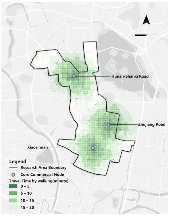 Isochronous analysis is a common method used to quantify traffic accessibility. Previous studies have highlighted that customer traffic is a consequence of commercial agglomeration. Merchandising is influenced by the density of foot traffic, and the areas with the highest density of foot traffic are usually the best locations from a traditional perspective []. Therefore, we opted to use the accessibility results obtained from the isochrone analysis to evaluate the location. In the following steps, we used QGIS to process the pedestrian dynamic traffic data to generate 20-min isochrones starting at the CCN with 5-min intervals (Figure 3); the lighter the color, the less accessible the area and the worse the micro-location.