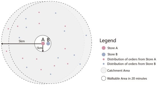 From a competitive business perspective, the difference in online sales between stores with overlapping spatial service areas provides an accurate indicator of competitive efficiency. To compare the competitive efficiency of stores under micro-location conditions, we constructed a model as shown in Figure 4 based on the above-mentioned 20-min isochronous circle. In general, the just-in-time delivery service radius is 5 km []. In this model, Store A is within a 5-min isochronous circle, and Store B is within a 20-min isochronous circle. Considering the limit distance (approximately 1 km) between A and B, the overlapping competition area between stores is the smallest at 87% of the service area. Therefore, it is reasonable to compare the competitive efficiency by volume difference.