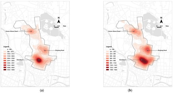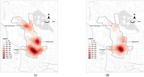 The UCSS, predominantly comprising restaurants and retailers, exhibited a clear spatial distribution pattern aligned with the CCN hierarchy (Figure 5). Specifically, the stores were clustered around three CCNs, namely Xiaosihuan, Zhujiang Road, and Hunan-Shanxi Road, in a circular pattern. Xiaosihuan was the area with the highest degree of commercial agglomeration, which was followed by Zhujiang Road and Hunan Road-Shanxi Road. In contrast, B&Cs basically followed this density distribution pattern.