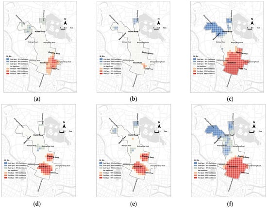 Hot spot area identification for numbers and PPI. (a) Number of B&Cs; (b) number of B&C restaurants; (c) number of B&C retail stores; (d) PPI of B&Cs; (e) PPI of B&C restaurants; (f) PPI of B&C retail stores.