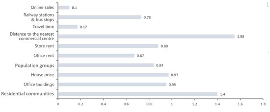 In selecting explanatory variables, we used the number of B&Cs as the dependent variable. Drawing from the literature review, we identified several categories of explanatory variables (demand scale, diversity of demand, economic costs, traffic costs, and online sales volume) from online business perspective, as shown in Table 1 [,,]. The primary reasons for choosing specific explanatory variables were as follows. (1) Population size is the main factor that directly affects the operation of B&Cs. In CBDs, community residents and white-collar workers are the main customers for takeaway consumption. However, data on the population size and the number of white-collar workers were difficult to obtain. Therefore, we used data on the number of residential communities and office buildings to represent the size of demand. (2) High-income population groups and different types of population groups tend to have diverse demands, triggering more stores to gather. However, owing to the unavailability of per capita income data and difficulty of quantifying group types, we chose two indicators, house price and office building rent, to reflect the diversity of demand indirectly. For different types of population groups, we quantified them through the calculation of information entropy based on POI types. (3) In terms of economic costs, store rent is one of the main economic costs of store expenditures, which directly affects the location of stores. (4) The convenience of transportation reflects the accessibility of stores and indirectly verifies the location strategy of different types of stores. We chose to reflect it through three indicators: the walking time to the nearest commercial node, the distance to the nearest commercial node, and the number of traffic stations. (5) The number of online sales represents the performance of the takeaway service, the activity level, and the concentration of delivery labor per unit of time.